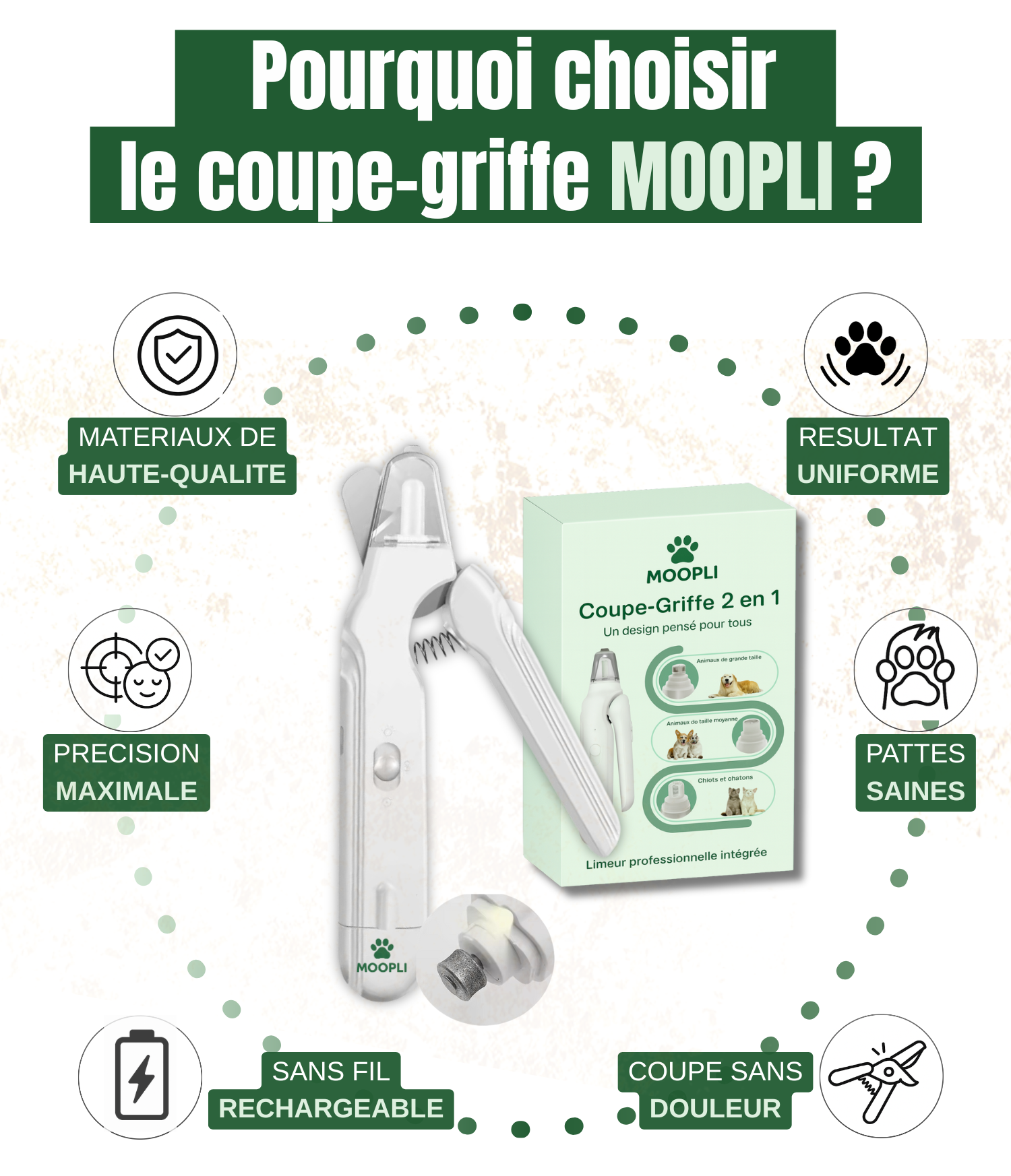 MOOPLI utilise deux lumières LED pour éclairer la partie sensible à l'intérieur de la griffe de votre animal, celle qui contient les vaisseaux sanguins et les nerfs (la partie vive), afin d'éviter les coupes douloureuses.